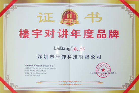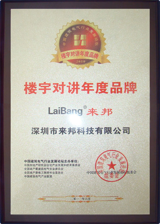 以下是來邦公司被評為“2011樓宇對講年度品牌”榮譽獎牌、證書: