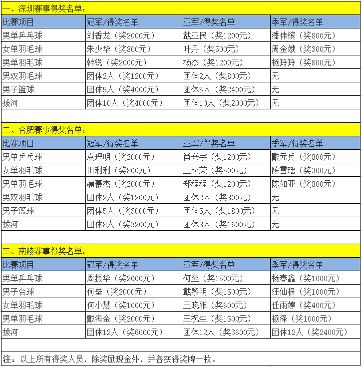 賽場上,運動健兒們激情飛揚、奮力拼搏,最終評出羽毛球、乒乓球、籃球、臺球、拔河競賽的前三名。公司對勝出者頒發(fā)了獎金和獎牌(附表)。